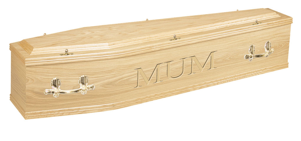 The Names is a quality oak veneered coffin trimmed with single mouldings, engraved name on the sides and a flat lid.